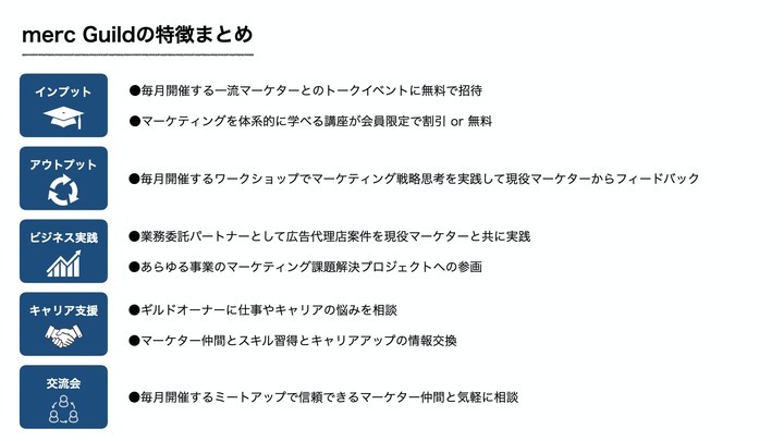 これが当社代表が、マーケターとしてキャリアを重ねる中で自身の経験から得た1つの答えであり、またその実現の場として「merc Guild」を作りました。コミュニティの中で、学習と実践を繰り返し、ディスカッションや意見交換を活性化することでマーケターとしての成長を後押しします。
