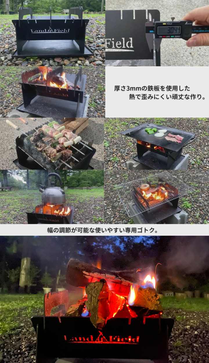 本製品は、手軽に焚き火を楽しめるよう、コンパクトサイズ、簡単組み立て、そして頑丈で永く使える事をコンセプトに設計いたしました。