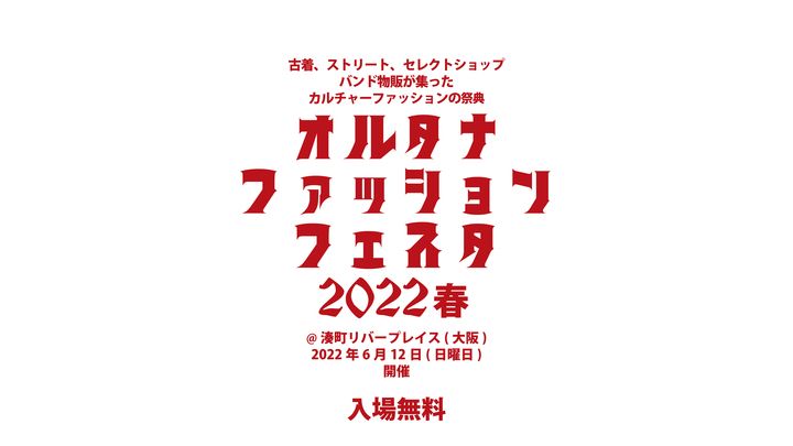 「オルタナファッションフェスタ2022春」が大阪湊町リバープレイスにて 2022年6月12日(日曜日)に開催されます。 前回は2021年11月6日に開催され、今回で第二回のイベント開催となります。 「音楽とファッションの共存」をコンセプトに、近年の「古着フェス」ブームに+αをしたファッションフェス。 古着屋だけでは無く、ストリート、セレクトショップ、雑貨屋などのアパレルショップとバンド物販の混合した新しい形式のファッションフェスのイベントが開催されます。 そして、バンド物販は日本最大のチャリティーフェス「COMING KOBE」に出演されているアーティストを中心に一部アーティストから物販で参加して頂きます。※当イベントにアーティスト本人の参加及びLIVEの演奏はございません。