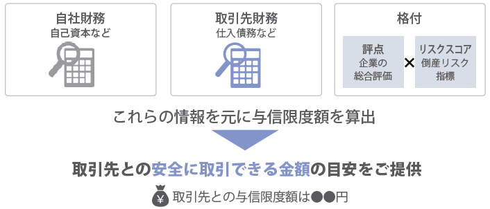 取引先といくらまでなら安全に取引できるかを、自社の財務内容、取引先の財務状況、企業の総合評価「評点」や倒産リスク指標「リスクスコア」を元に算出される格付などを用いて、統一された計算方法で算出した金額です。