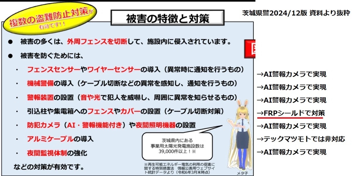 「AI警報カメラ」を展開し太陽光発電所の銅線窃盗犯の撃退に成功している テックマツモト(東京都西東京市/代表・松本敏治)は FRP素材を利用した銅線窃盗対策の工法を12月16日ウエブサイド上に公開した。