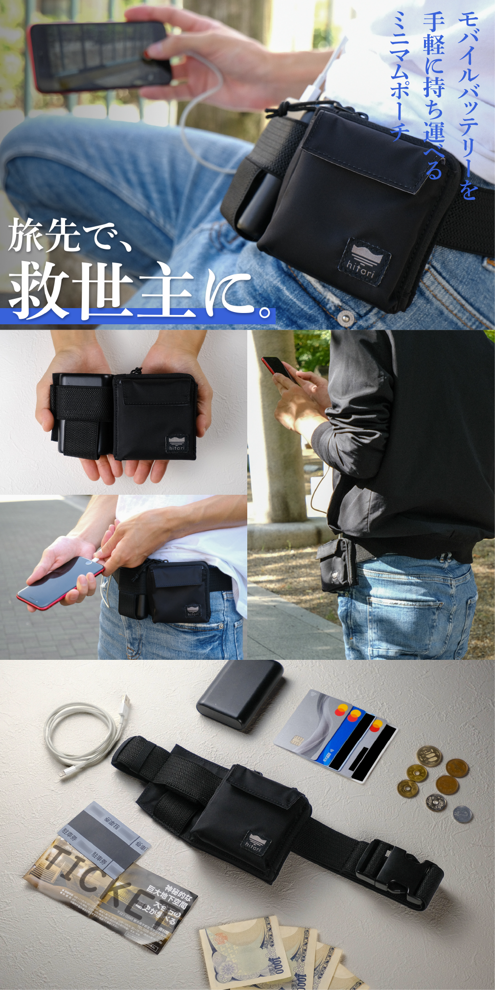 モバイルバッテリー専用設計で、スマホ充電と必需品を一つにまとめたミニマムなデザインが特徴。服の下に隠せるほど薄く、軽く、旅先で装着の存在感を忘れて楽しめる事を目的に設計されています。