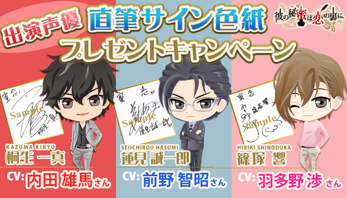 公式サイトでの事前登録をされているお客様を対象に、指定の応募メッセージをTwitterでツイートして下さった方の中から、抽選で各5名様(合計15名様)に、出演する男性声優陣3名のサイン色紙をプレゼントいたします。
