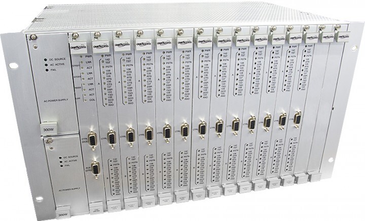 集合型アナログモデム「CN4」は、6Uのシャーシに最大15枚のモデムカード「Aster5 TWIN-CV」を装着可能です。「Aster5 TWIN-CV」1枚に2台のモデムが実装されているので、1シャーシあたり最大30モデムまで搭載可能です。制御カード「1035 ORCHID」を搭載すれば、複数シャーシのカスケード接続も可能です。(最大7台まで)。また、別売の電源モジュールを2台実装すれば電源を冗長化でき、より安定的な運用に貢献します。