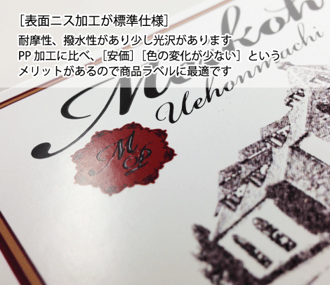 PP加工に比べ[安価][色の変化が少ない]という商品ラベル印刷に