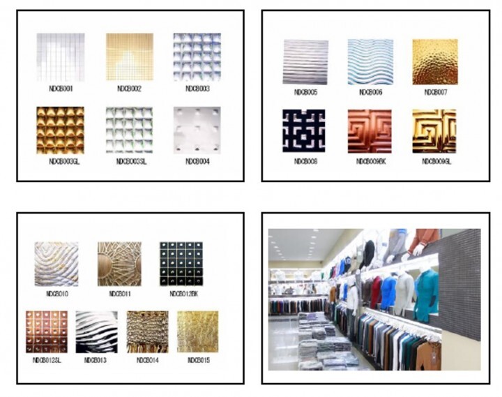 デザインパターンは、シンプルな方眼・ウェーブ模様から、より複雑な3D(立体)模様まで、15種類とさまざまなパターンをご用意し、使用場所・使用用途などのお客様のニーズに合わせて選択することができます。パネルのサイズは1㎡~3.9㎡。色調もゴールド、シルバー、ブロンズ調などバラエティに富んでおり、照明など光の当て方を工夫することで、より個性豊かな壁面装飾を可能にいたします。ショーウインドーやショールーム、イベントブースの背景のほか、オフィスやホテル、舞台・演劇などの空間演出にも最適です。