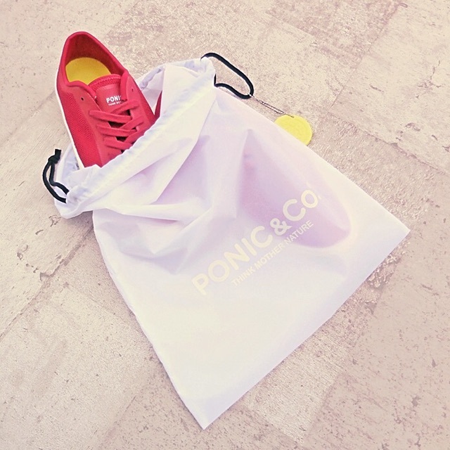 PONICのシューズを入れたり、海などのレジャーへ出かける際には水着やタオル、着替えなどを入れたりと使い道たくさんの大きめサイズです。(縦42×横32cm)