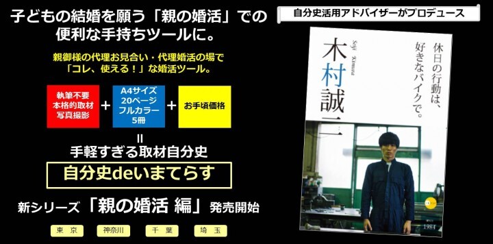 本格的で低価格な自分史制作代行「自分史deいまてらす」を企画・制作するスポットライト合同会社(本社:横浜市中区)は、求婚の日である1月27日より子供に代わって結婚相手を探す「親の婚活」をされる親御様向けに自分史制作・取材ノウハウを使い、代理婚活の場で我が子をアピールする便利な手持ちツールになる、新シリーズ「親の婚活編」を発売開始。