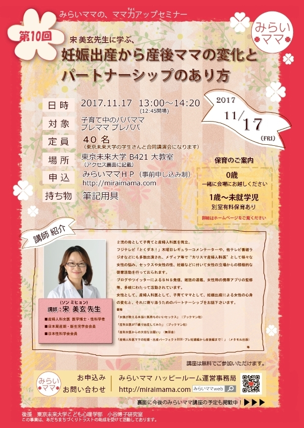 足立区を中心に子育て支援に取り組む「みらいママ」(所在地:東京都足立区、代表:下坂えりこ)は、第10回みらいママ講座 「宋美玄先生の「妊娠出産から産後のママの変化とパートナーシップのあり方」を、区内の東京未来大学で開催します。