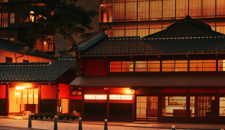 加賀水引・加賀友禅などの伝統工芸をちりばめた客室や、スタッフが披露する加賀獅子舞など、伝統とモダンが融合した宿。山中漆器や九谷焼の器で料理とのマリアージュを楽しめます。名物料理「活蟹のしめ縄蒸し」は、ミシュランガイド富山・石川(金沢)に掲載。