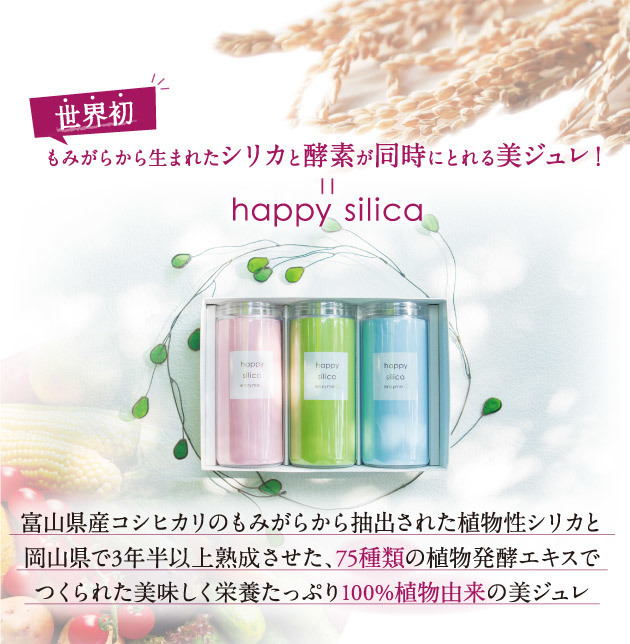 『ハッピーシリカ』はもみ殻100%のシリカ(ケイ素=ミネラル)と75種類の植物酵素を一緒に摂取できるエコ商品「美ジュレ」として、2017年9月の発売から人気を集めてきました。植物性シリカと酵素がジュレで一度に摂取できるものは他に例をみません(当社調べ)。酵素とシリカを同時に摂取することで、酵素の働きが一層促進され、ミネラルは栄養素として摂取されて相乗効果が生まれます。