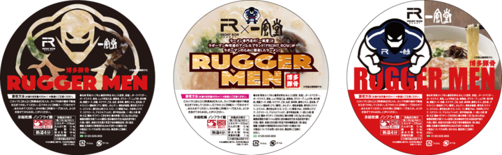 【商品紹介】 試合後や練習後のスポーツ選手達(ラガーメン)の胃袋をガッツリと満たしてくれる「RUGGER MEN 博多豚骨」には、濃厚なスープと中太麺を採用。一風堂創業当時から今に引き継ぐ原点の味「白丸元味」をヒントに、食べ応え満点のオリジナルカップ麺に仕上げました。「FRONT ROW RUGBY」限定デザインのパッケージは3種類。デザイン違いの3個を1セット¥1,000(税込)、36個(3デザイン×12個)を10,000(税込)で販売します。