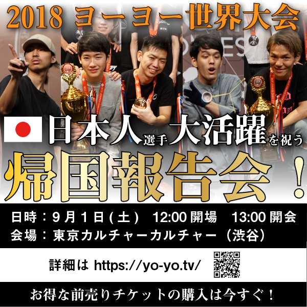 ヨーヨーバラエティ番組「Yo-Yo TV」は、2018年9月1日(土)に、東京都渋谷区「東京カルチャーカルチャー」にて、「ヨーヨー世界大会 日本人選手 帰国報告会」を開催いたします(後援:日本ヨーヨー連盟)。
