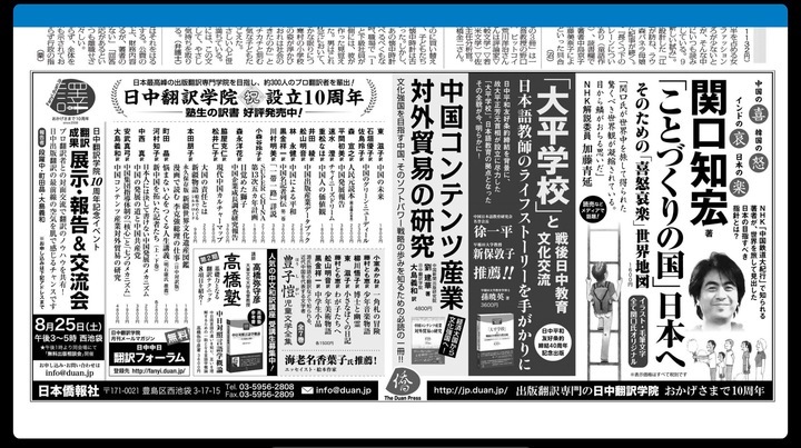 【日本僑報社発】毎日新聞にこのほど掲載した全五段広告(8月19日付)の効果でしょうか。テレビの“鉄道の旅”で知られる関口知宏さんの『「ことづくりの国」日本へ』(小社刊)への注文が、全国各地の書店やオンライン書店から殺到してます。本当にありがたいことで、この場を借りて厚く御礼を申し上げます。