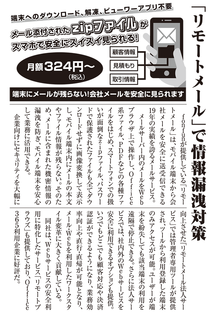 株式会社fonfun(読み:フォンファン、代表取締役社長:林和之、証券コード:2323 JASDAQ)のメールを中心にテレワークを支援する「リモートメール(コンシューマー向けサービス、法人向けサービス)」、WEBベースのテレワーク支援サービス「リモートブラウズ」が、日経産業新聞(8月29日発行)の「テレワークに役立つ注目ソリューション」として掲載されました。 「リモートメールで情報漏洩対策」と題し、端末にメール本文が残らないことに加え、スマートフォンでは扱いが面倒なzipファイル、パスワード付ファイルも全て端末にダウンロードせずに確認できるリモートメールの機能により、メールに含まれる機密情報の漏洩を防ぎ、モバイル端末を安心して業務に活用できると紹介いただきました。