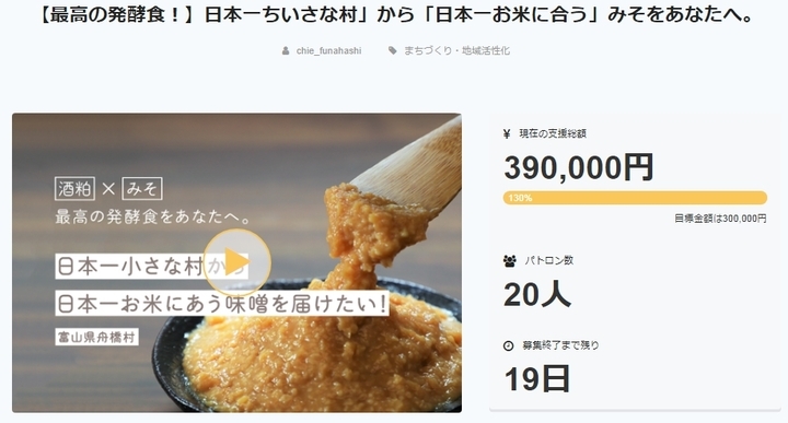 【富山発・最高の発酵食づくり!】 「日本一ちいさな村」から「日本一お米に合う」みそをあなたへ。 舟橋村のクラウドファンディングプロジェクトが目標達成!