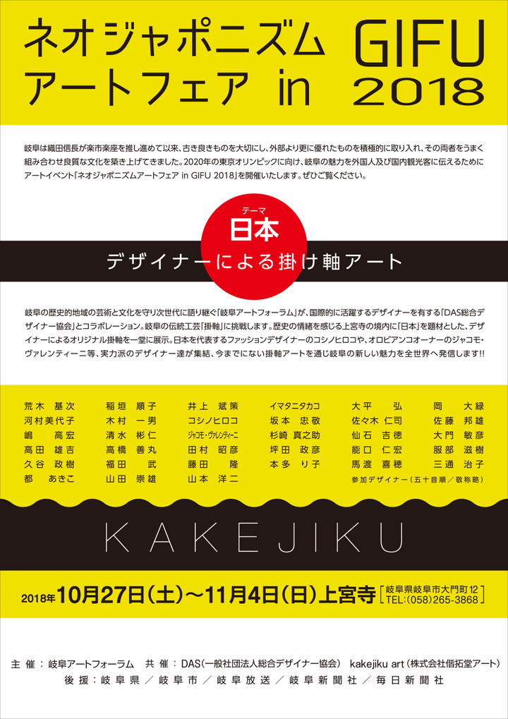 日本を代表するファッションデザイナーのコシノヒロコ氏や、オロビアンコオーナーとして名高いジャコモ・ヴァレンティーニ氏等、国内外問わず実力派のデザイナー総勢33名が「日本」を題材とした岐阜の伝統工芸品「掛軸」の制作に挑戦し、アートを通じて岐阜の新しい魅力を全世界へ発信するアートイベント 「ネオジャポニズムアートフェア in GIFU 2018」を開催します