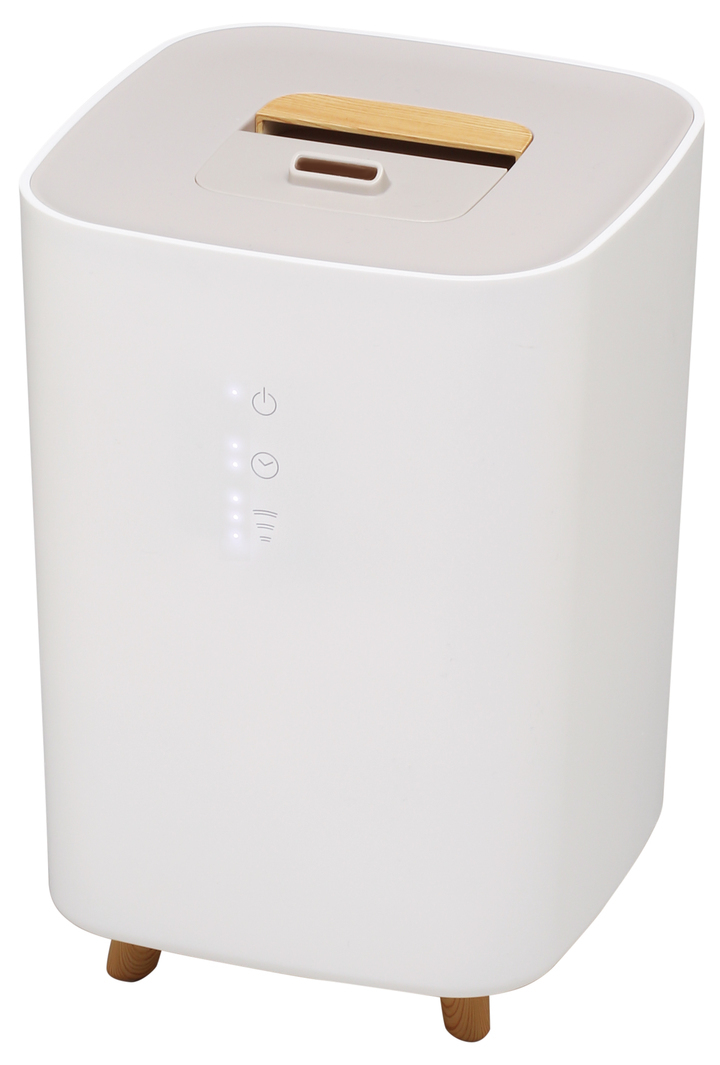 A4サイズの用紙(タテ29.7×ヨコ21センチ)よりも小さな面積を実現しながら、2.5リットルの大容量タンクを搭載。1時間あたりのミスト量を100・150・250ミリリットルの3段階で調節でき、最長約16時間の連続使用が可能なハイブリッド式アロマ加湿器です。