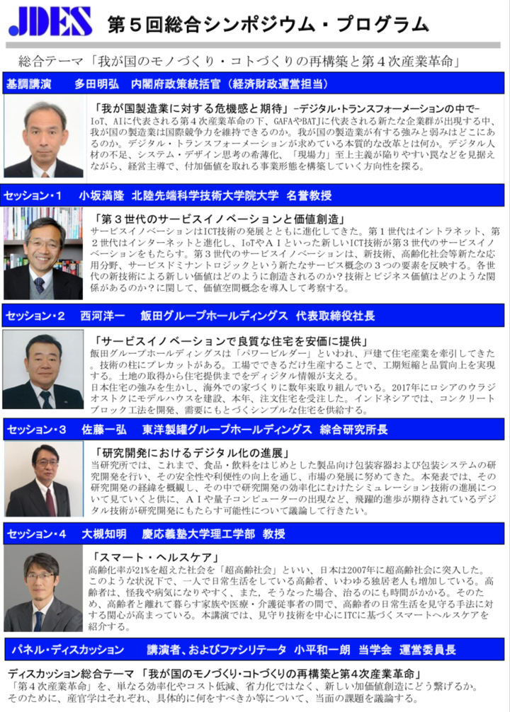 第5回 総合シンポジウムでは、総合テーマを「我が国のモノづくり・コトづくりの再構築と第4次産業革命と題し、基調講演として内閣府政策統括官の多田明弘様に登壇いただくほか、北陸先端科学技術大学院大学名誉教授の小坂満隆様、飯田グループホールディングス代表取締役社長の西河洋一様、東洋製罐グループホールディングス綜合研究所長の佐藤一弘様、慶応大学理工学部教授の大槻知明様に、セッションでの発表をいただきます。