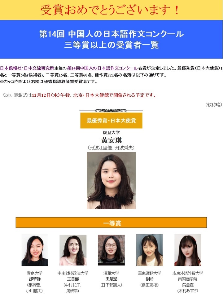 1)第14回「作文コンクール」最優秀賞・日本大使賞 復旦大学の黄安琪さんに決定!