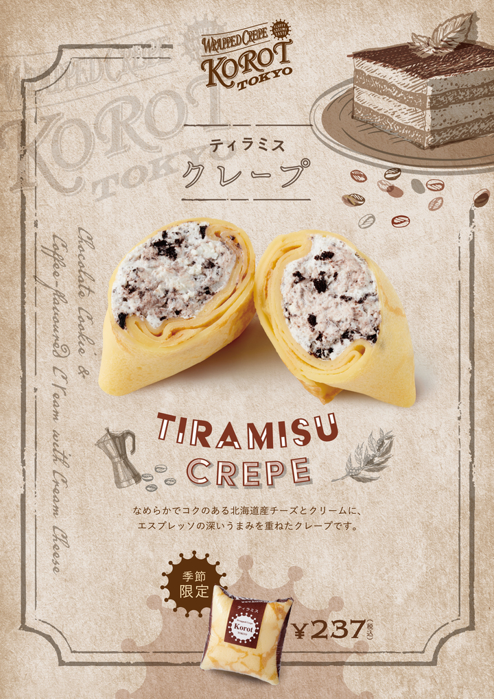 もちもち食感のミニクレープ「ラップドクレープ コロット」(http://www.korot.jp)を運営している トラボックス株式会社(本社:東京都渋谷区 代表取締役社長:吉岡 泰一郎)は、 11月1日(木)~30日(金)まで、新発売となる『ティラミス クレープ』を期間限定で販売いたします。