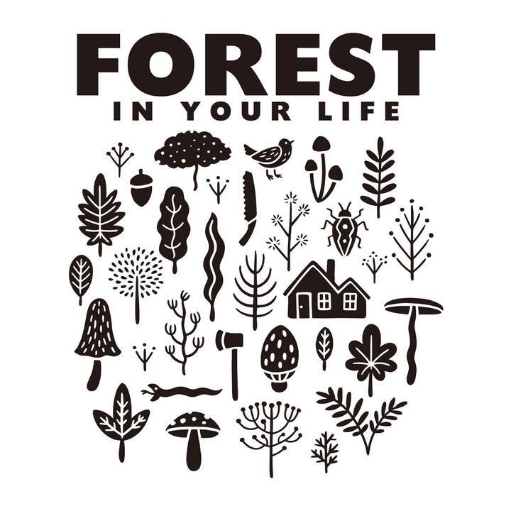2. デザインのテーマは「森とともに暮らす社会」。木々や葉っぱに混ざり、森づくりに必要なノコギリなどの道具と、キノコや森に生息する生き物たちを描き、森とともに生きる社会を表現しました。