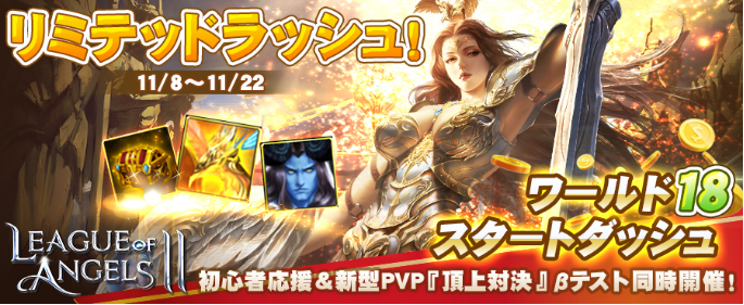 ACCESSPORT(アクセスポート)株式会社(本社:東京都港区、代表取締役社長:沈 海寅)は、ダークファンタジーMMORPG『League of AngelsⅡ(リーグオブエンジェル)』において、本日2018年11月8日(木)に新サーバー「ワールド18」をオープンし、同日よりリミテッドラッシュキャンペーンにて、対象サーバーでキャラクター作成いただき、条件を達成した方に、豪華なアイテムプレゼントします。また、そちらを記念した「ANGEL16」キャンペーンを開催。本キャンペーンは、現時点で最高レア度であるGR英雄を最大で5体獲得することができる、非常に豪華な内容となっています。