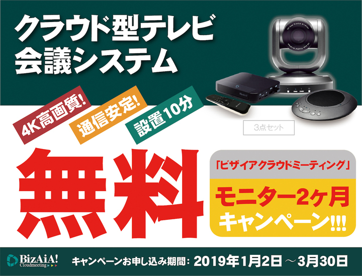 アジア進出した日系企業をサポートするメディア事業会社(株)ビザイア(所在地:東京東京都台東区蔵前3-19-8、代表:趙舒林)は、2019年 1月2日より新年キャンペーンとして「ビザイアクラウドミーティング」テレビ会議システムを、2ヶ月無料でモニター導入できるキャンペーンを実施する。