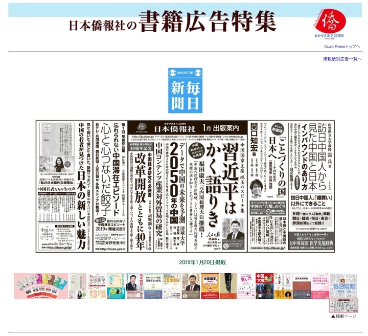 日本僑報社、朝日新聞、毎日新聞、読売新聞など全国紙に書籍広告出稿