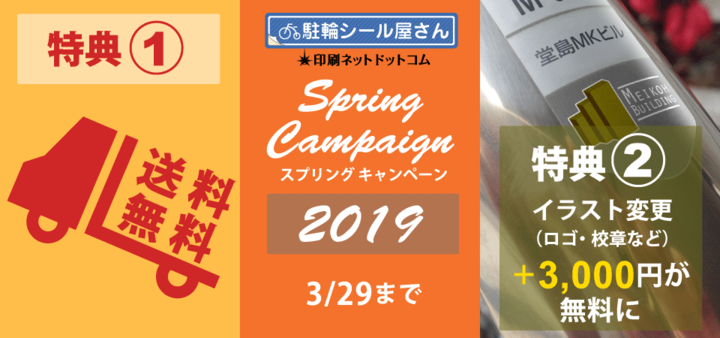 印刷ネットドットコム【駐輪シール屋さん】春の送料無料キャンペーンを開始。ご発注者様全員送料無料。さらにマンションロゴ、学校校章などへのイラスト変更通常3000円が無料に。締切は2019年3月29日(金)発注完了分まで