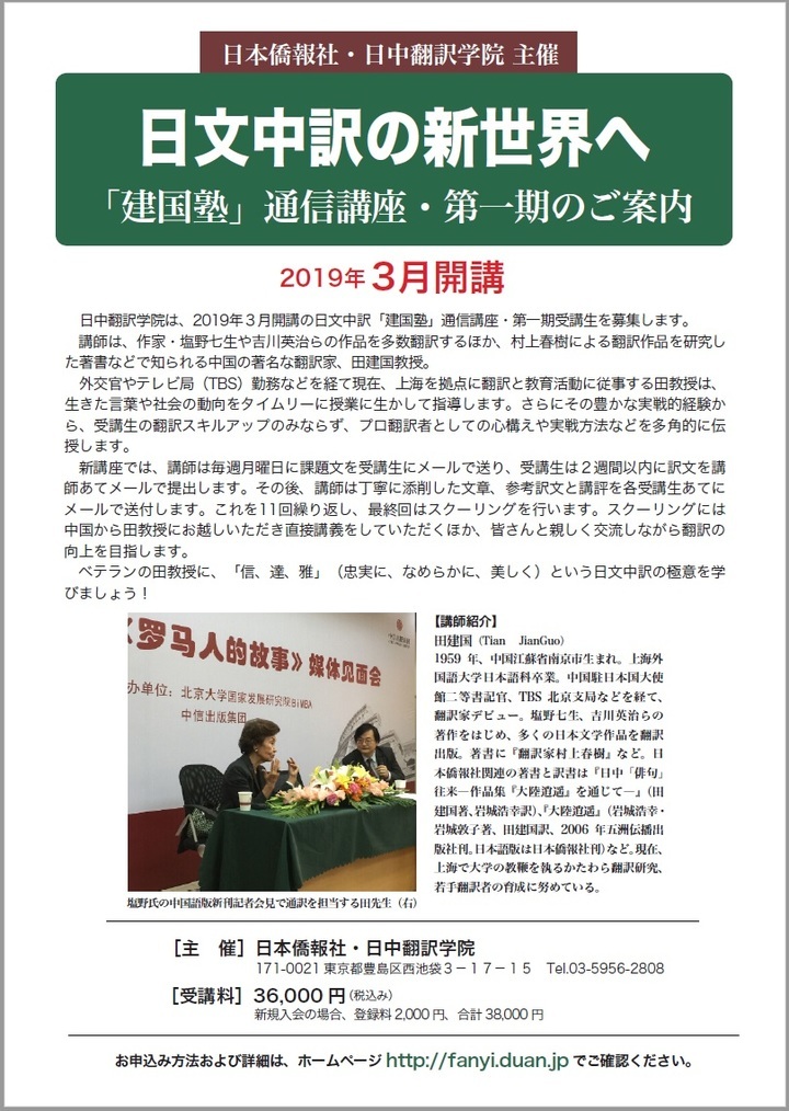 4)日中翻訳学院の新講座、田建国教授に学ぶ日文中訳の「建国塾」、3月より開講へ