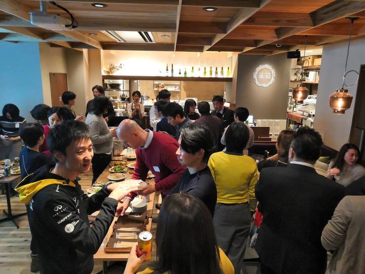毎月恒例の交流パーティーでは外部参加の起業家、スキルアップに関心のある方々も歓迎して、つながりを拡げ合う目的で毎月開催しています