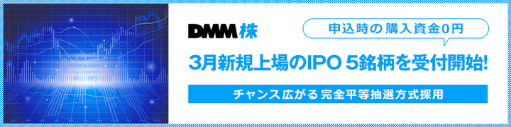 株式会社DMM.com証券(本社:東京都中央区、代表取締役 谷川龍二)は、2019年2月22日(金)より、オンライントレード【DMM株】にて、3月に新規上場予定のIPO5銘柄の追加受付を開始いたしました。