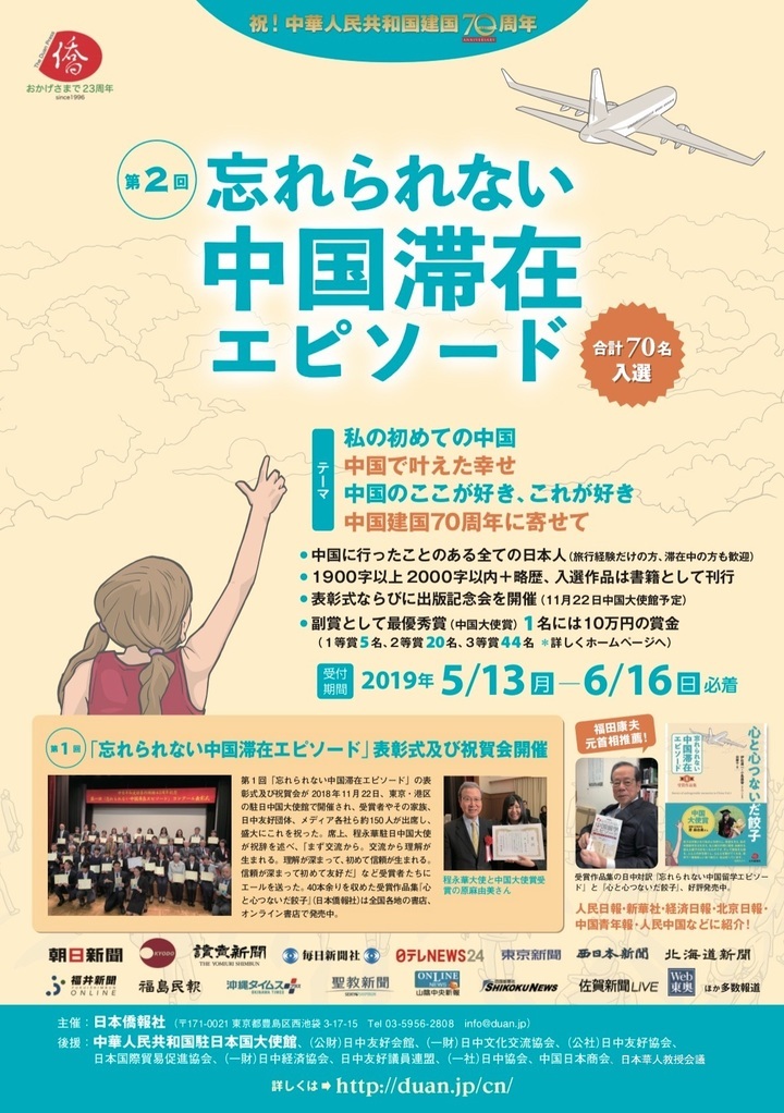 【日本僑報社発】日本僑報社は2019年、中国に行ったことのある日本人を対象とした第2回「忘れられない中国滞在エピソード」原稿を大募集します!