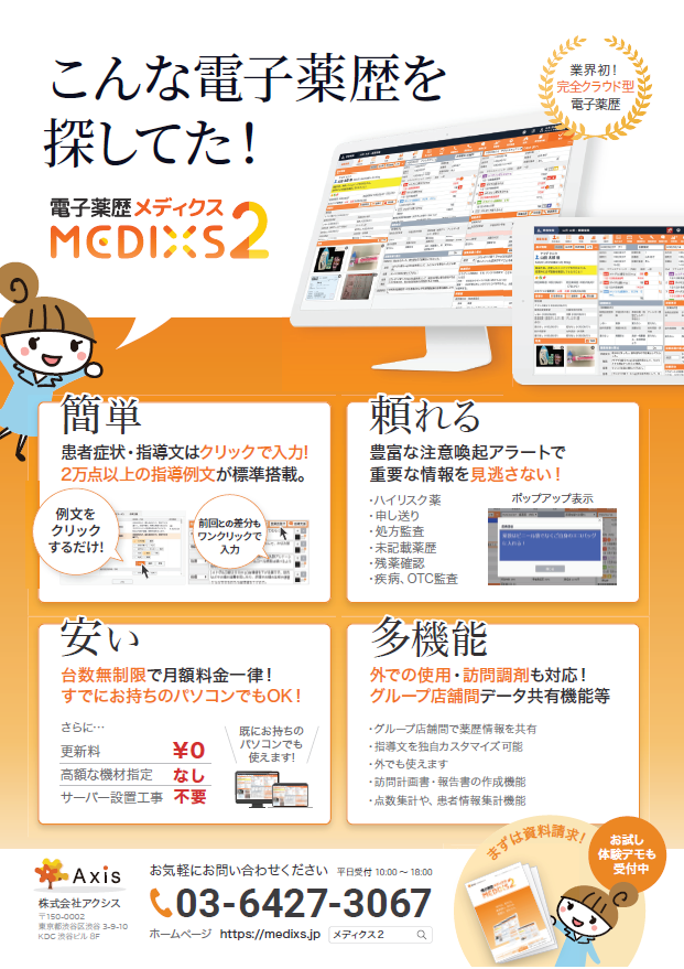 株式会社アクシス(本社:東京都渋谷区、代表取締役 近藤一馬)は、調剤薬局業務を支援するソリューション、ネットワーク型電子薬歴「メディクス2」を、2019年3月15日(金)-17日(日)まで幕張メッセで開催される、第19回JAPANドラッグストアショー(主催:日本チェーンドラッグストア協会)に出展いたします。