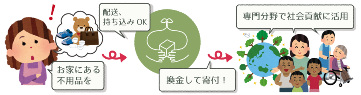 不用品をそのまま必要としている団体に寄付する取り組みは多くがあるが、使途が限られてしまう。NPO不用品物品寄付の会を通し、換金するプロセスを挟むことで、「寄付者の“キッチン用品”が“教育分野”を支援する」などを可能にする。