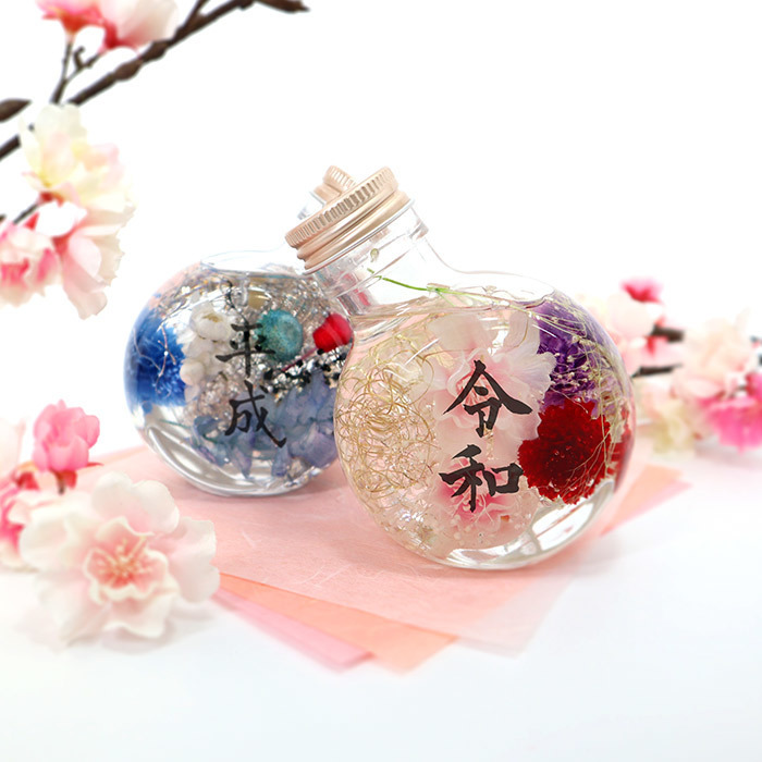 話題の新元号「令和」をテーマにした和風ハーバリウムがどこよりも早く登場!由来となった万葉集の歌になぞらえ、新春の光にゆれる花々のようなうららかなハーバリウムは、ころんとした丸型ボトルが可愛い稀少な一品。今年ならではの贈り物にぴったり。「平成」ハーバリウムとのセットもございます。