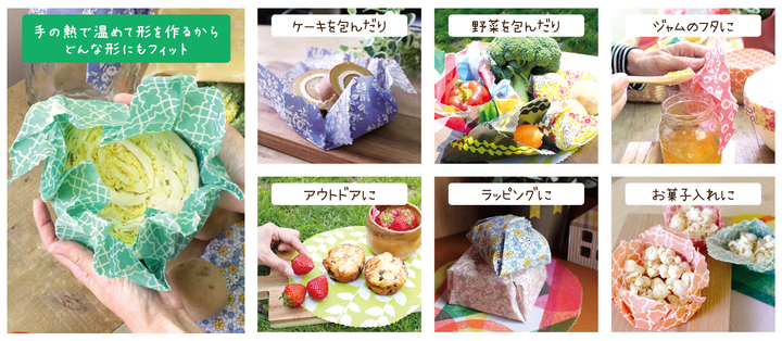 好きな布で作ったラップで、いろんなものを包めるので、お料理の時間やパーティーも、さらに楽しくなります。ゴミを出さないので、アウトドアでお皿代わりに使ったり、食べかけのものを包んだり…ホームパーティーに持参する器をかわいくラップしたり…活躍の場所はいっぱいです。