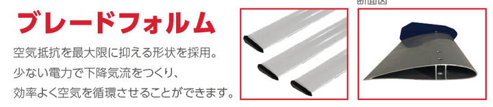静音・ハイパワーのドイツ製モーターを採用。また、アルミブレードは、空気抵抗を最大限に抑える形状のため、省電力で効率よく大風量を実現します。