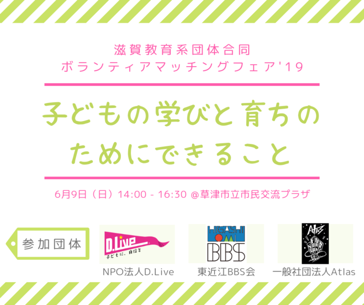 大津市・草津市で不登校支援を中心にした子どもの居場所づくりを手掛ける、NPO法人D.Live(所在地:滋賀県草津市矢橋町105-1-406、代表:田中洋輔)は、滋賀教育系団体合同ボランティアマッチングフェア’19 -子どもの学びと育ちのためにできること-を、2019年6月9日(日)に開催します。