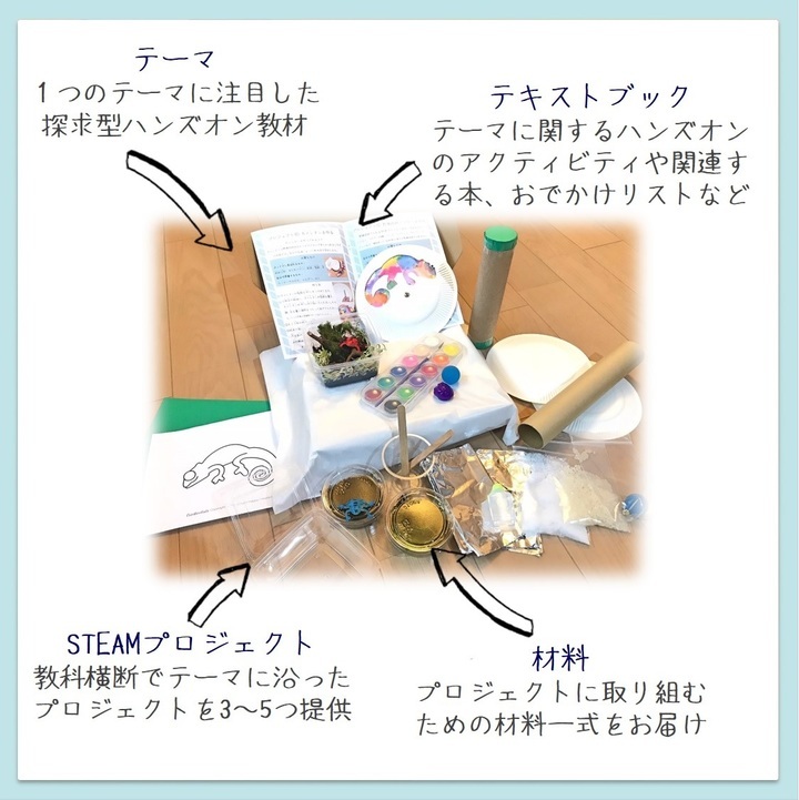 1つのテーマに対して、教科横断(言語、算数、理科、社会、美術、料理など)で探求するための環境としてSTEAMプロジェクトと実施のための材料をオールインワンで提供します。