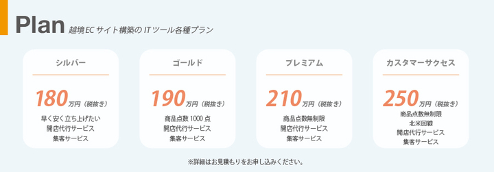 全国の中小企業様向けに、海外向けECサイト開発の費用を抑えながらも最短で売上を上げることを目的とした様々なプランがある。
