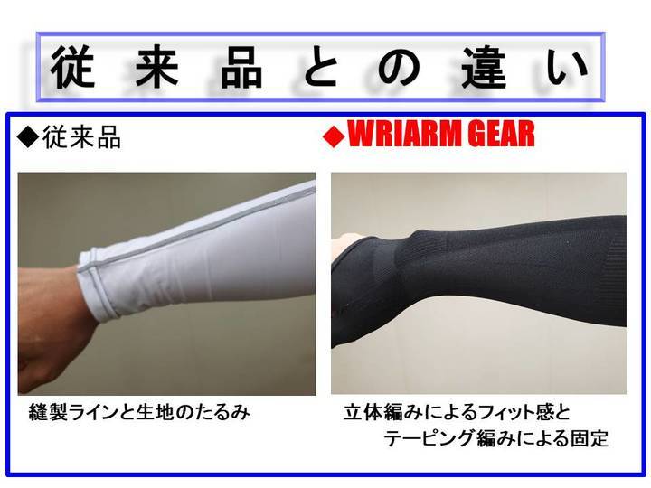 創業100年の靴下工場で作られたWRIST(手首)+ARM(腕)を同時にサポートするWRIARM GEAR(リアームギア=手首&アーム一体型サポーター)を開発しました。 今まで無かった固定&着圧の機能を高めた装備を使って、更にスポーツを楽しみ長く楽しみ、ポテンシャルを高めてください。新しい感覚へ