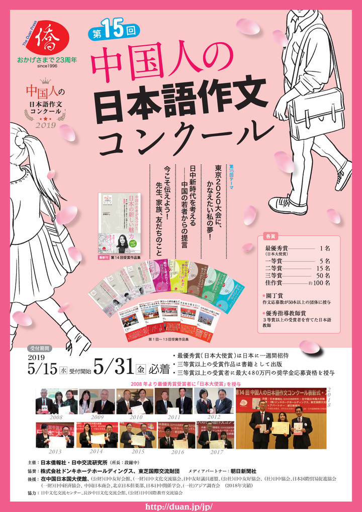 ※第15回「中国人の日本語作文コンクール」の応募状況については、これまでの報道をご参照ください。http://duan.jp/news/jp/20190821.htm