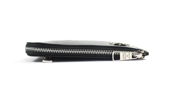 合成皮革でありながら、防水加工が施され汚れにも強く、劣化しにくい素材(ポリカーボネート)が配合されているため耐久性が高い。サロン・ド・アルファード独自の軽さ・実用性とブランドのシンボルでもあるスマイルマークはそのままに。表面にはスタッズをあしらい、RIKACOさんらしいクールなデザインを採用。内ポケットには、さりげないRIKACO×SALON DE ALFURD TOKYOの箔押しを施した。