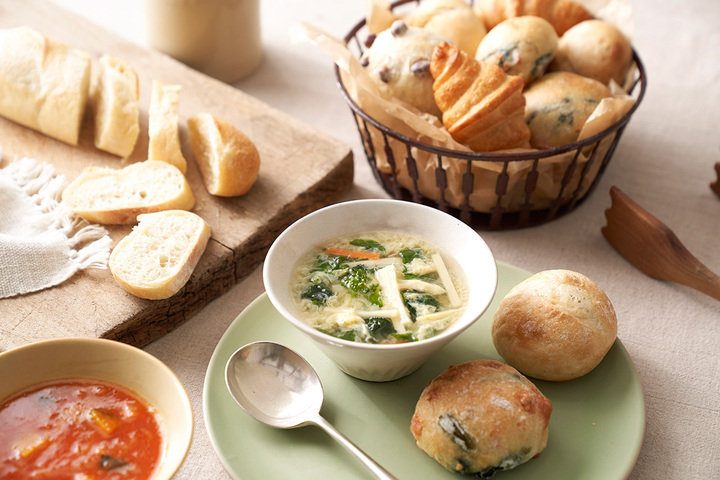 Pan&のパンは、お食事に合うように少し小さめに作られており、また素材本来の味を楽しんでいただくために、余計なものが入っていないからカロリーが抑えられています。カロリーが高めと思われがちなクロワッサンも、1個あたり111kcal。また、スープ各種も、「野菜を食べるミネストローネ」は80kcal、「筍と菜の花のふわふわ卵スープ」はわずか52kcalととっても低カロリー。パンは、各包装袋に1個当たりのカロリーも表示されているので、カロリー計算もしやすい仕様になっています。