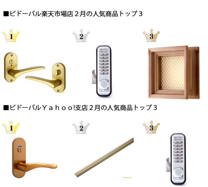 建築金物卸売通販サイト「ビドーパル」が楽天市場店とYahoo!支店の2月の総合人気ランキングトップ3を発表