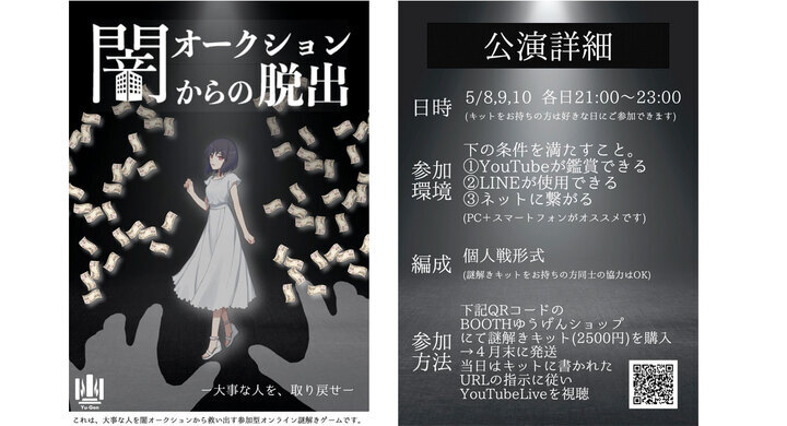 在宅で参加できるオンライン謎解きゲームイベント「闇オークションからの脱出」を開催 映像企画制作などを手掛ける、ペルソナシート合同会社は、「イベント制作団体ゆうげん」とコラボレーションして新型コロナの集団感染リスク影響下で集団活動・イベント開催自粛が続く中、「謎解きイベント」の新しいアプローチとしてネット配信をベースとした謎解きゲームイベント「闇オークションからの脱出」を開催します。 ●謎解きゲームイベント「闇オークションからの脱出」 日程 5/8(金)〜10(日)21:00から開始 今回は自宅のパソコンやスマートフォンを使用して謎解きを行います。 ただ環境として、LINE@・Youtubeなどを使用するため、パソコン+スマートフォンなどの形式をお勧めいたします。