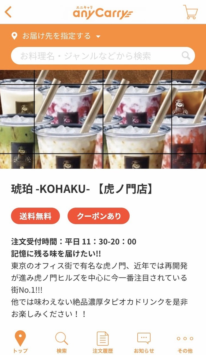 シェアリングプラットフォーム運営企業である株式会社エニキャリ(東京都港区)にタピオカファクトリー「琥珀 -KOHAKU-」が、フードデリバリーサイト「エニキャリ(anyCarry)」に新規オープンしたことをご報告します。より手軽により便利によりお得にタピオカドリンクが出前でご自宅・職場にてお楽しみ頂けるようになりました。