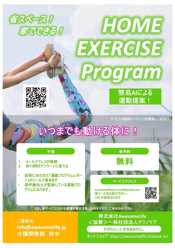 一般社団法人テクノケア(神奈川県平塚市)と株式会社AwesomeLife(神奈川県平塚市)が共同で2020年4月24日に「ホームエクササイズプログラム」サービスを開始した。本サービスは少ない設問に答えることでタイプ分類さらには適した運動プログラムがレポートとして提案される。 当法人は長年に渡り、遠隔診断の可能性について研究開発を進めており、本年はRemoteTherapist®認定事業も開講する運びとなった。対面とは違う遠隔ならではの利点を活かし今はまでにない価値提供を行うことを目指している。その活動で得たデータ並びにロジックを活かし、簡易なシステムとして構築されたのが、本サービスとなる。 新型コロナウィルスによる自宅待機は思った以上の心身機能を低下させている現状を目の当たりにし、これ以上の問題が起きる前の対応策としてシステムを構築した。